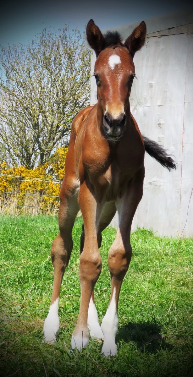 Meridian Gold is an eye catching bright bay sporthorse filly with 4x white socks, star & snip by Jaguar LICENSED AES for jumping (KWPN Amoureux x JetSet D) out of Vibrant Gold (Free Spirits Gold x Derwen Gentleman). A great cross of warmblood with some TB and Welsh Cob she correctly put together with strong joints, good bone and mature physically for her age; a lovely model with straight floating movement. Sweet natured with an intelligent kind eye, loves nothing more than a good mutual grooming session. To mature approx 16.1hh, Meridian Gold is a riding horse type with potential to succeed locally in any (or all) of the 3 main disciplines with eventers, jumpers and dressage all in his pedigree however she could very much excel in the show ring as a riding horse or light hunter. Homebred and raised on good grass and haylage (not filled with hard feed), rugged if required, and stands for hoof trims with the farrier. She is well socialised with other horses and winters outside. Passported with the AES (Anglo European Studbook), microchipped and vaccinated.