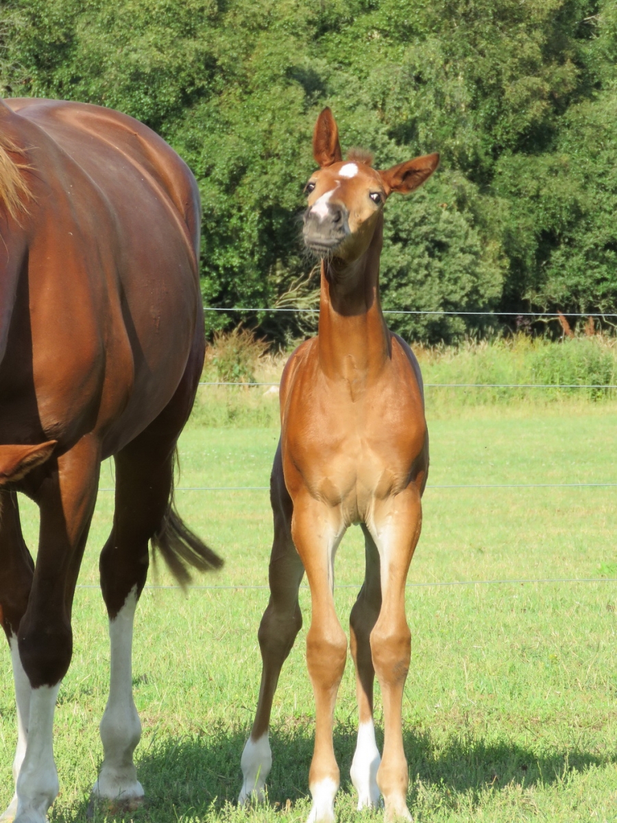 Her sire Horizon (Amoureux x Domino Van T’Heike (Ferro) x Dominard) is a young stallion with a big future. At only 3 years old he was inspected and licensed by the AES and the inspector commented that he had not seen such a stunning and correct stallion in a long time. Horizon has the whole package; eye-catching looks, elastic uphill movement and beautiful conformation. He is correct and straight with wonderful elevation – the horse version of a ballerina.