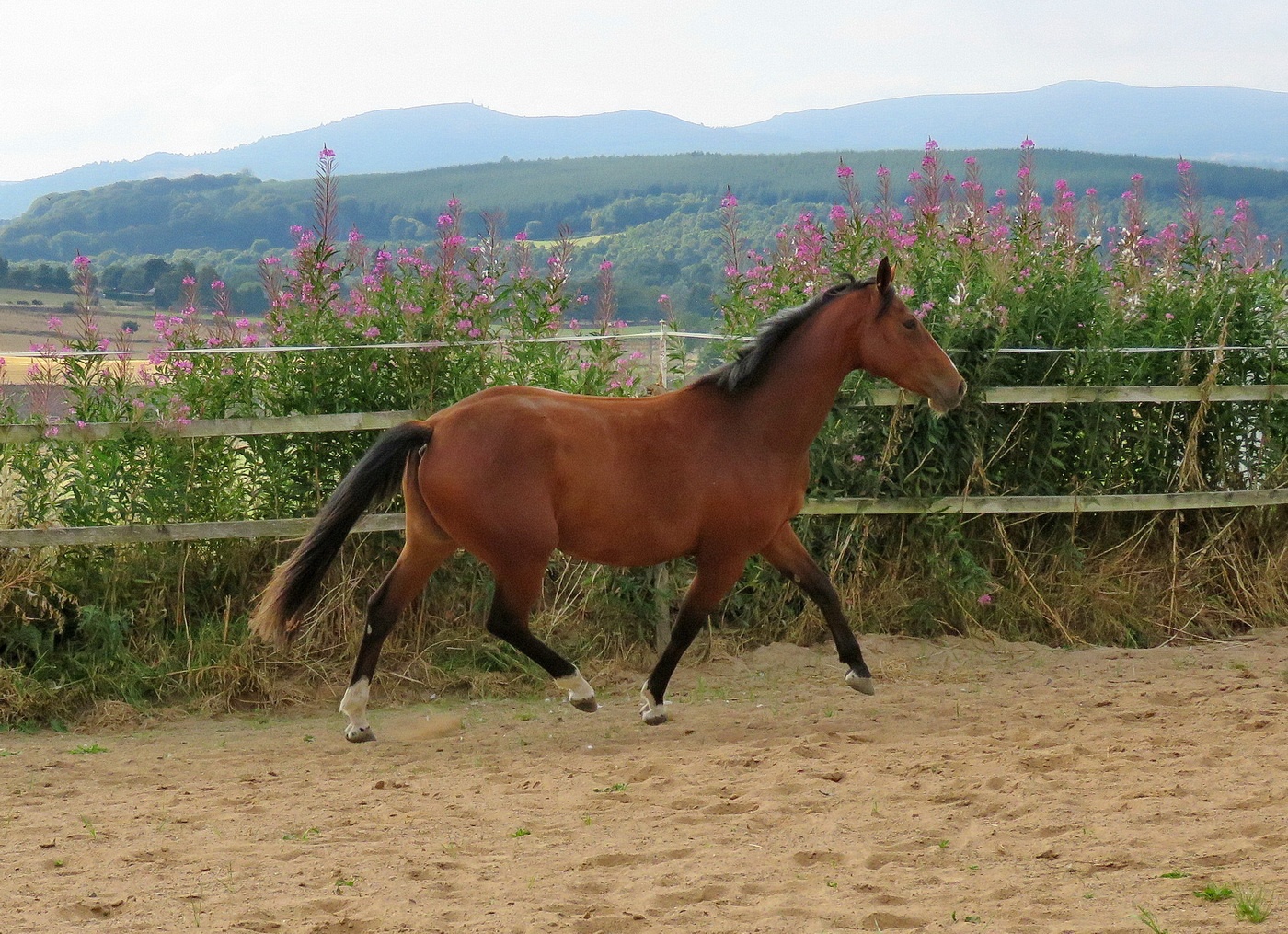 Precious Horizon, a stunning bright bay sporthorse filly with 3x white socks and stripe by Horizon out of Vivid Gold (Free Spirits Gold x Derwen Gentleman). A great cross of warmblood with some TB and Welsh Cob she correctly put together with strong joints, good bone and mature physically for her age; a lovely model with straight floating movement. Sweet natured with an intelligent kind eye, loves nothing more than a good mutual grooming session. To mature approx 15.1hh, she is a small hunter type with potential to succeed locally in any (or all) of the 3 main disciplines with eventers, jumpers and dressage all in her pedigree however she could very much excel in the show ring as a riding horse or light hunter. Homebred and raised on good grass and haylage (not filled with hard feed), rugged if required, and stands for hoof trims with the farrier. She is well socialised with other horses and winters outside. Passported with the AES (Anglo European Studbook), microchipped and vaccinated.