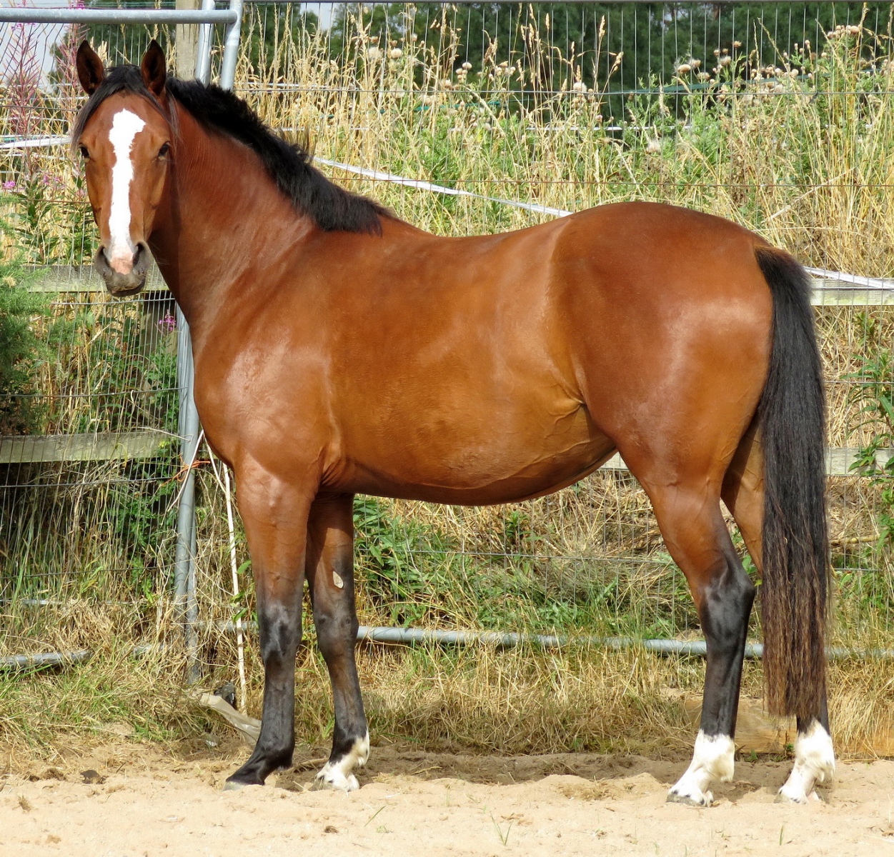 Precious Horizon, a stunning bright bay sporthorse filly with 3x white socks and stripe by Horizon out of Vivid Gold (Free Spirits Gold x Derwen Gentleman). A great cross of warmblood with some TB and Welsh Cob she correctly put together with strong joints, good bone and mature physically for her age; a lovely model with straight floating movement. Sweet natured with an intelligent kind eye, loves nothing more than a good mutual grooming session. To mature approx 15.1hh, she is a small hunter type with potential to succeed locally in any (or all) of the 3 main disciplines with eventers, jumpers and dressage all in her pedigree however she could very much excel in the show ring as a riding horse or light hunter. Homebred and raised on good grass and haylage (not filled with hard feed), rugged if required, and stands for hoof trims with the farrier. She is well socialised with other horses and winters outside. Passported with the AES (Anglo European Studbook), microchipped and vaccinated.