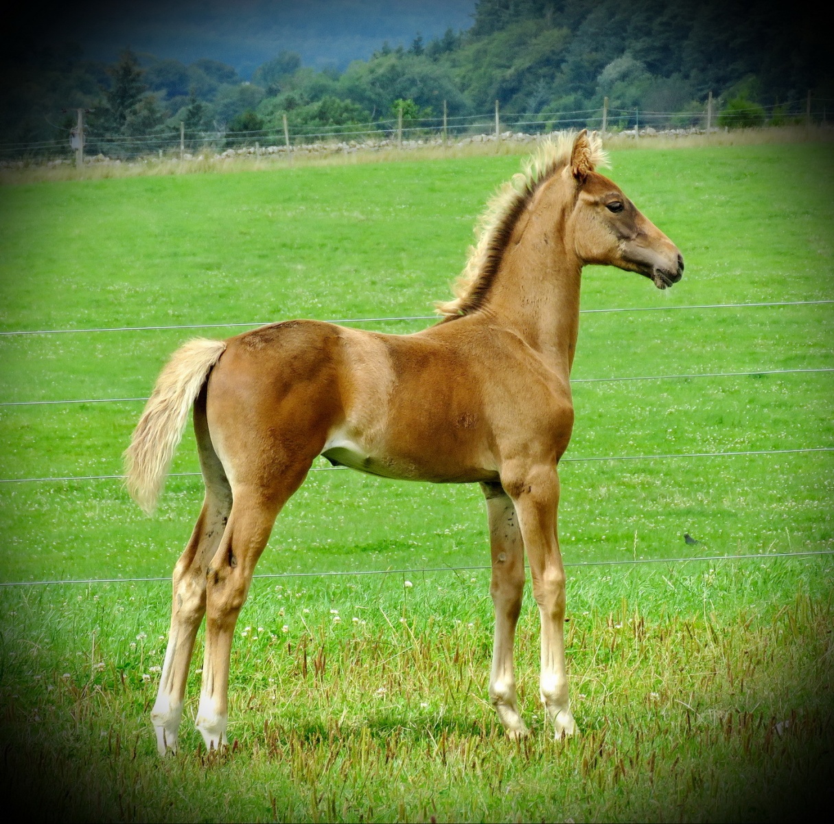 Rainbow Horizon carries 1x copy of the Silver Dilute gene which gives her this stunning, unusual colour. This young girl born 2021 is full of character, and has a loving, sensitive nature. Out of a Scottish Sports Horse mare, by the famous silver dilute KWPN stallion Horizon (AES Licensed), she is a good model with light correct movement however has been seen to dish. She is a riding horse type with potential to succeed in any of the 3 main disciplines. As a potential broodmare Rainbow is DNA test EeAaZz which means she is capable of producing Silver Black foals. Handled since birth, she is halter trained, rugged if required, loads/travels in our horsebox and stands for hoof trims with the farrier. She is well socialised with other foals/horses of all ages, is a good doer and winters outside. Passported with the AES (Anglo European Studbook), microchipped and vaccinated against flu and tetanus.